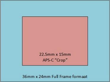 Full-frame camera's worden zo genoemd omdat het formaat van de sensor die ze bevatten, even groot is als het negatief is bij analoge digitale spiegelreflex camera's die met film werken. Dit formaat is 24 bij 36 mm. Het gehele systeem waarop spiegelreflex camera's gebouwd zijn is gemaakt (en geoptimaliseerd) rondom dit formaat film. Omdat het maken van een full-frame sensor prijzig is, hebben de fabrikanten besloten om camera's te maken met een kleinere sensor (APS-C formaat, 22.5 bij 15 mm). Van het totale beeld wordt dan eigenlijk alleen nog maar het middelste gedeelte gebruikt. Op de foto hierboven zie je het verschil tussen een full-frame en een APS-C sensor formaat. Doordat je bij een crop-camera slechts een deel van het totale beeld pakt, is het alsof je objectief een groter telebereik heeft. Je maakt als het ware een uitsnede van een groter beeld, vandaar de term crop-factor. De crop-factor is de 'vergroting' die plaatsvindt doordat je de uitsnede krijgt in plaats van het volledige beeld. Feitelijk is er natuurlijk geen vergroting, je gooit alleen maar beeldinformatie weg. Een groothoekobjectief wordt dus een flink stuk minder groothoek. Aan de andere kant kan een crop-camera interessanter zijn voor iemand die veel tele-objectieven gebruikt.